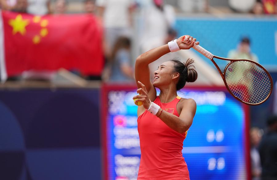 لاعبة التنس الصينية تشنغ تشين ون تحتفل بعد الفوز بالميدالية الذهبية في منافسات فردي السيدات في أولمبياد باريس في 3 أغسطس 2024. (شينخوا)