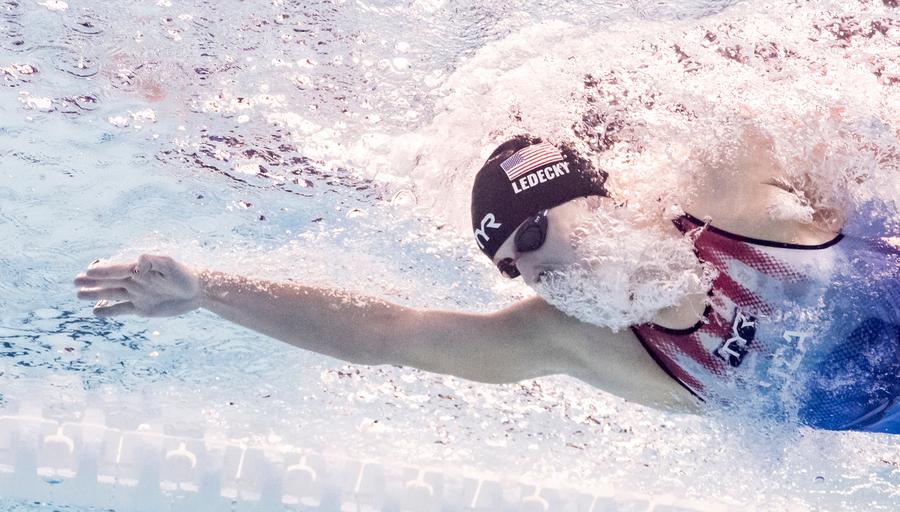 الأمريكية كايتي ليديكي خلال مشاركتها في نهائي سباق 800 متر سباحة حرة للسيدات في أولمبياد باريس في 3 أغسطس 2024. (شينخوا)