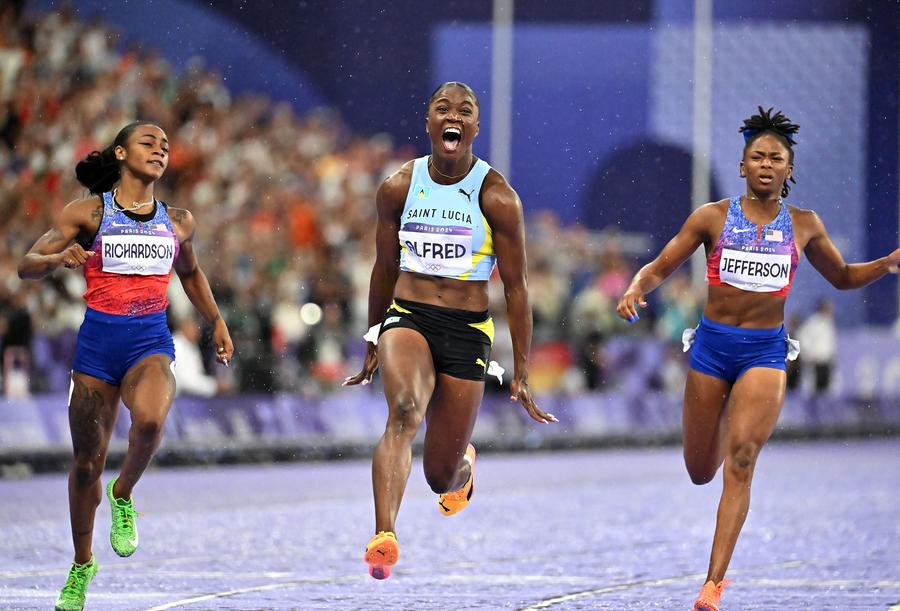 على ملعب "ستاد دو فرانس"، حصدت العداءة ألفريد أول ميدالية ذهبية أولمبية لسانت لوسيا بفوزها في نهائي سباق 100 متر سيدات، حيث كانت أول من قطع خط النهاية بزمن قدره 10.72 ثانية، متقدمة على الأمريكية شاكاري ريتشاردسون التي حصلت على الميدالية الفضية بزمن قدره 10.87 ثانية. وجاءت ميليسا جيفرسون، وهي أيضا من الولايات المتحدة، في المركز الثالث بزمن قدره 10.92 ثانية.