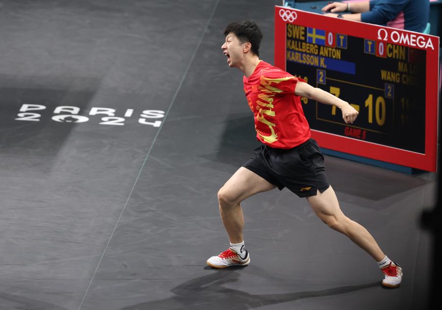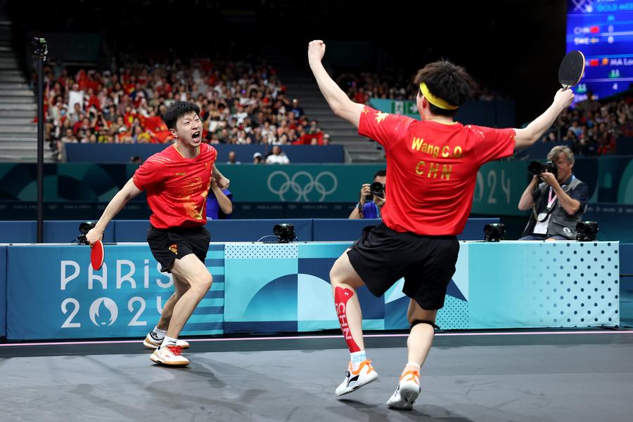 ما لونغ (على اليسار) ووانغ تشو تشين من الصين يحتفلان بعد فوزهما في مباراة الزوجي خلال نهائي منافسات فرق الرجال لتنس الطاولة في أولمبياد باريس يوم 9 أغسطس 2024. (شينخوا)