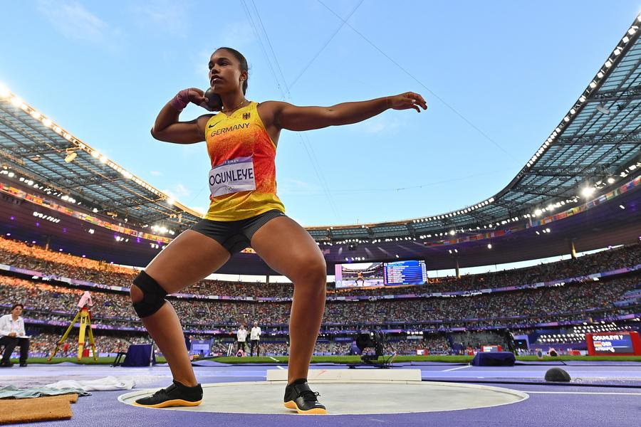الألمانية يميسي أوغونلي تتنافس في نهائي مسابقة دفع الجلة للسيدات في أولمبياد باريس يوم 9 أغسطس 2024. (شينخوا)