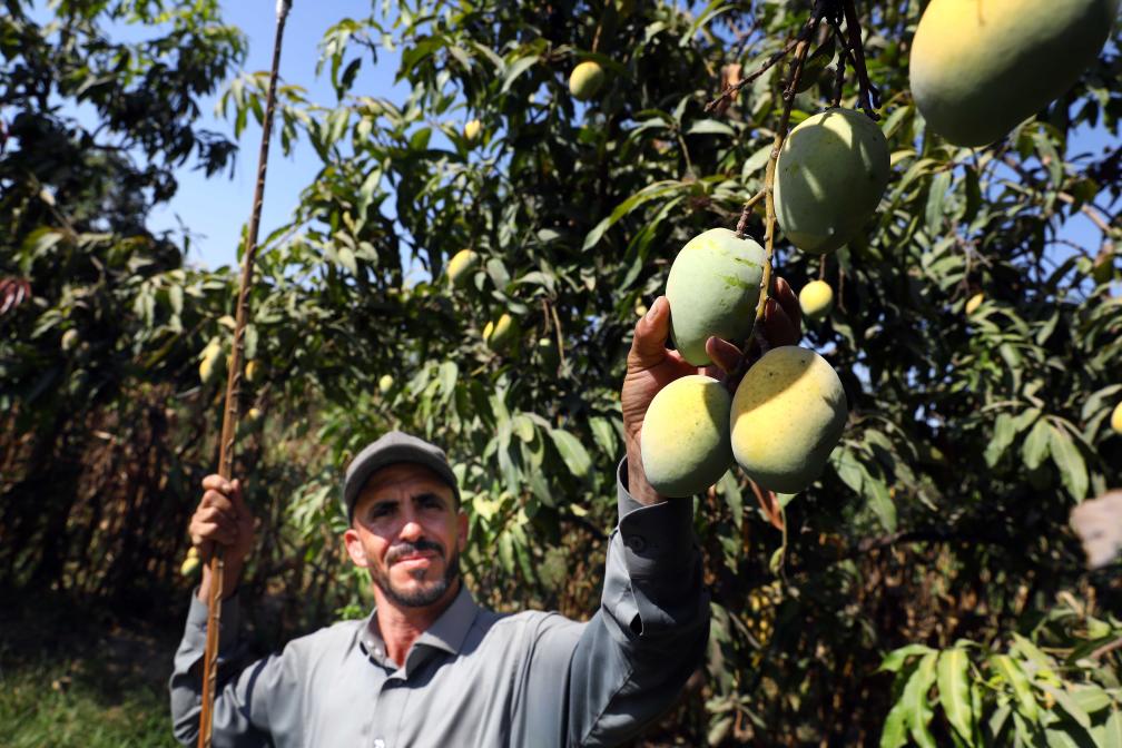 القاهرة 12 أغسطس 2024 (شينخوا) في الصورة الملتقطة يوم 11 أغسطس 2024، مزارع يحصد ثمار المانجو في مزرعة في محافظة الإسماعيلية في مصر.