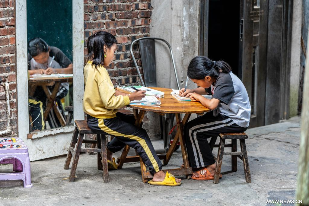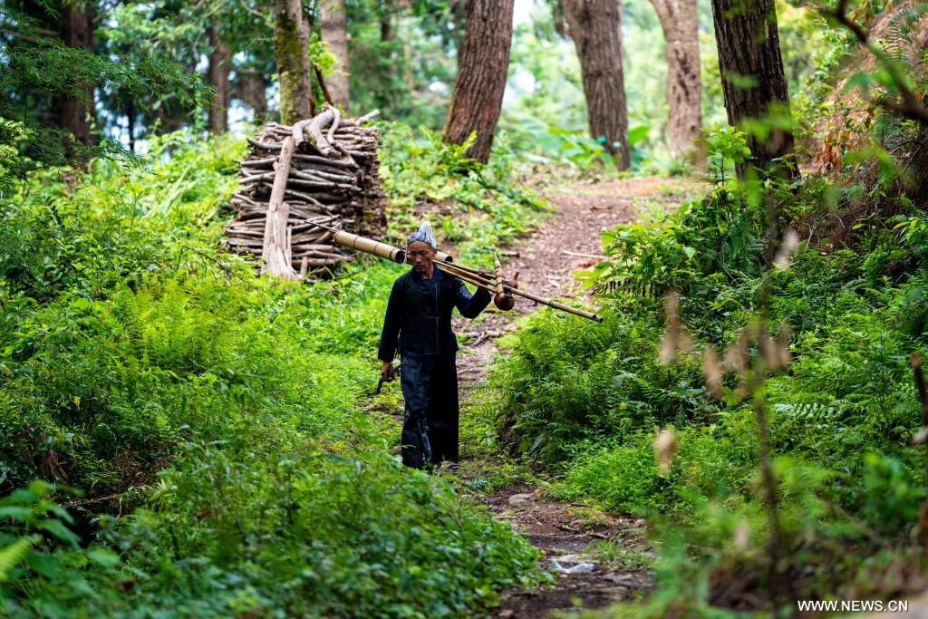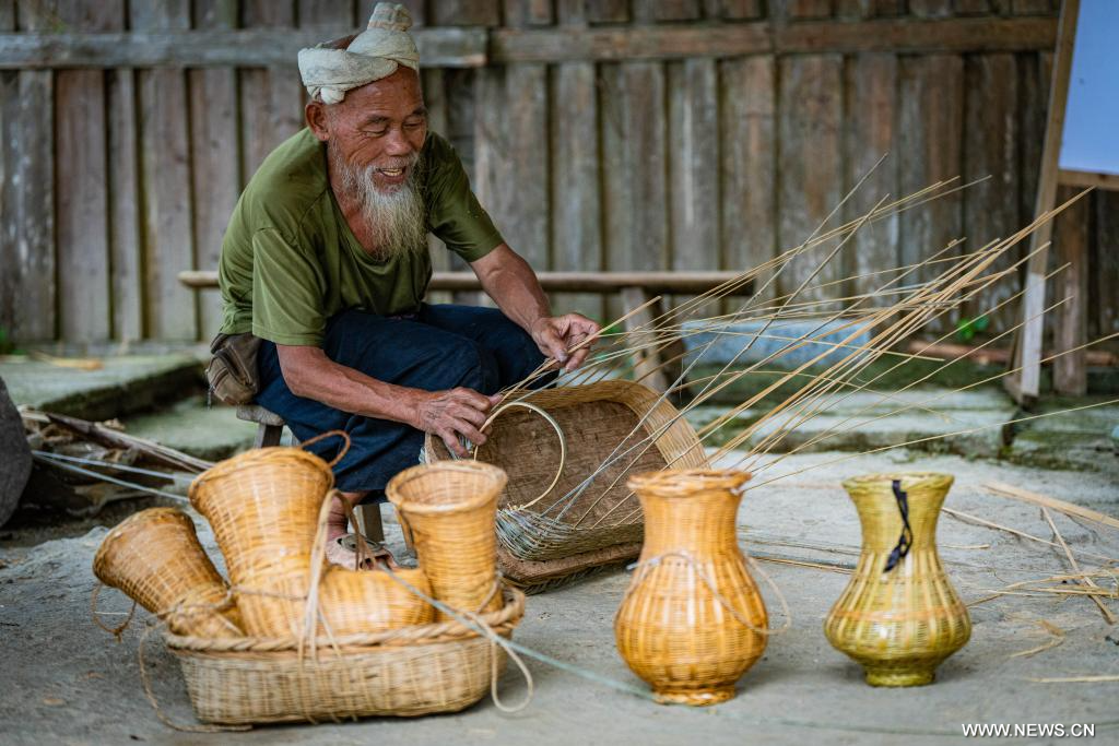 تسونغجيانغ 18 أغسطس 2024 (شينخوا) في الصورة الملتقطة يوم 16 أغسطس 2024، قروي يصنع سلال من الخيزران في قرية باشا في محافظة تسونغجيانغ بولاية تشياندونغنان ذاتية الحكم لقوميتي مياو ودونغ بمقاطعة قويتشو جنوب غربي الصين.