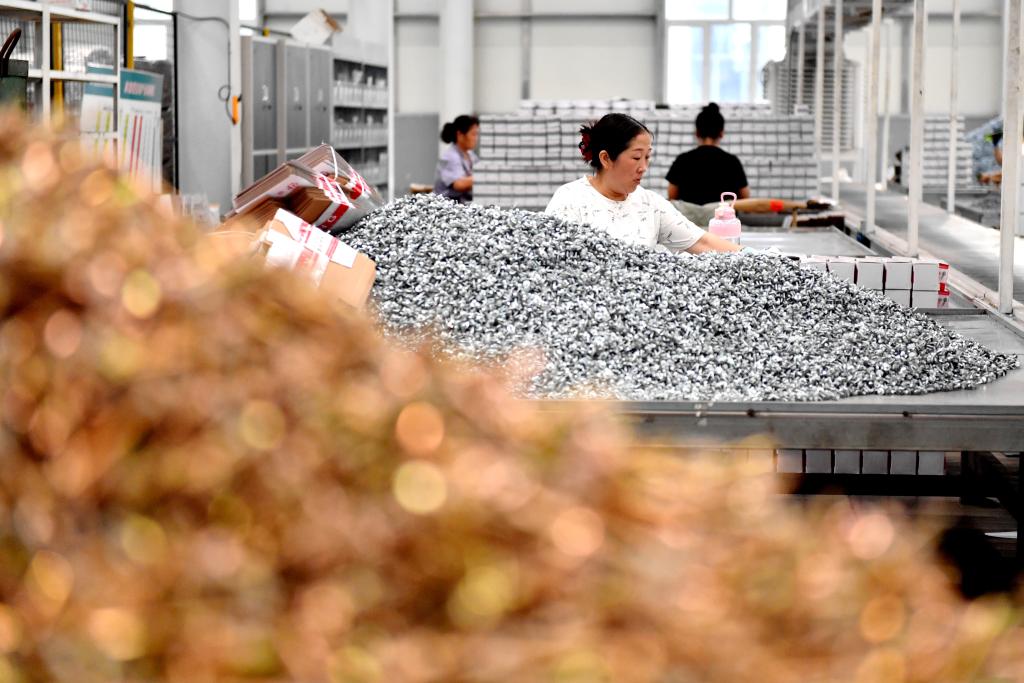 هاندان 18 أغسطس 2024 (شينخوا) في الصورة الملتقطة يوم 16 أغسطس 2024، عمال يعملون في ورشة تعبئة لشركة لتصنيع أدوات التثبيت في حي يونغنيان بمدينة هاندان بمقاطعة خبي في شمالي الصين. وتوجد في مقاطعة خبي أكثر من 200 شركة لأدوات التثبيت. وفي عام 2023، أنتجت هذه الشركات ستة ملايين طن من أدوات التثبيت، ما يمثل 58 في المائة من حصة السوق الوطنية، حيث توجد سلعها في أسواق أكثر من 110 دول ومناطق.
