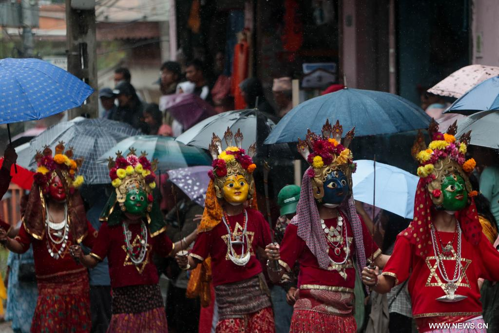كاتماندو 21 أغسطس 2024 (شينخوا) في الصورة الملتقطة يوم 21 أغسطس 2024، عارضون يرتدون أقنعة يشاركون في الاحتفال بمهرجان خادجا جاترا في العاصمة النيبالية كاتماندو.