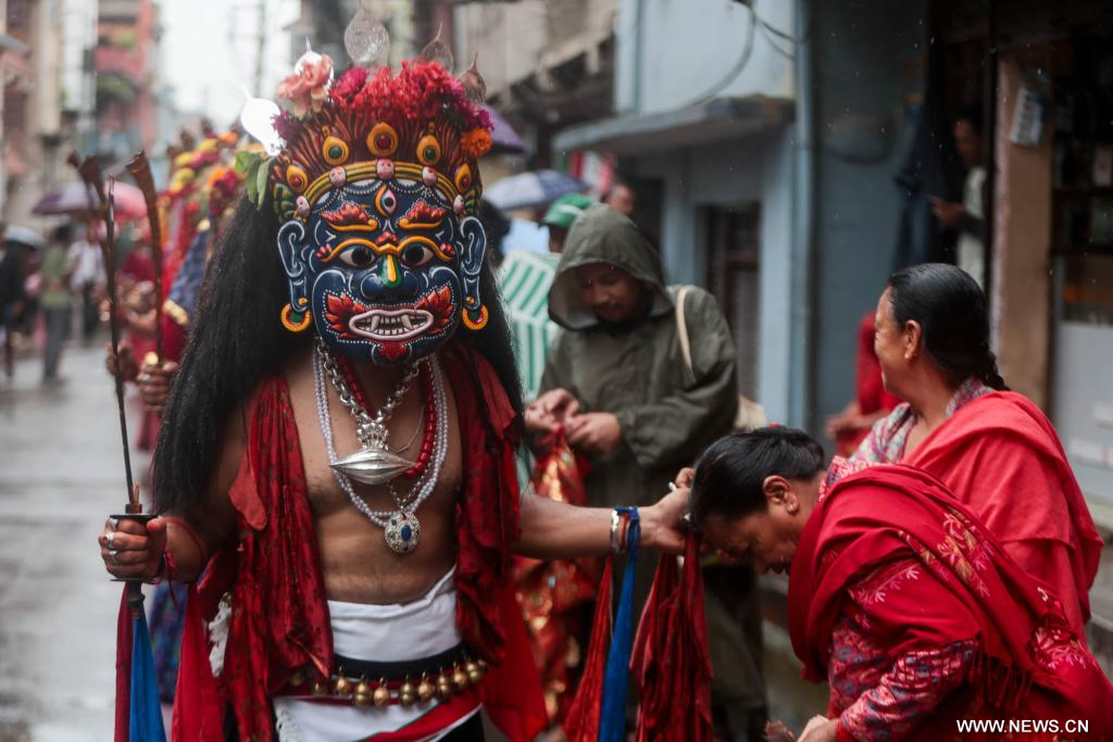 كاتماندو 21 أغسطس 2024 (شينخوا) في الصورة الملتقطة يوم 21 أغسطس 2024، فنان يرتدي قناعا يشارك في الاحتفال بمهرجان خادجا جاترا في العاصمة النيبالية كاتماندو.