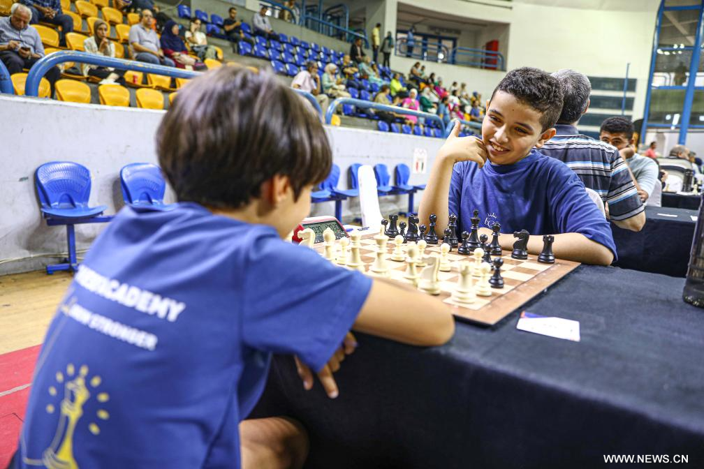 القاهرة 22 أغسطس 2024 (شينخوا) في الصورة الملتقطة يوم 13 أغسطس 2024، عبد الرحمن سامح محمد، الطفل البالغ من العمر 10 سنوات (يمين الصورة)، خلال مشاركته في بطولة محلية للشطرنج أقيمت في العاصمة المصرية، القاهرة.