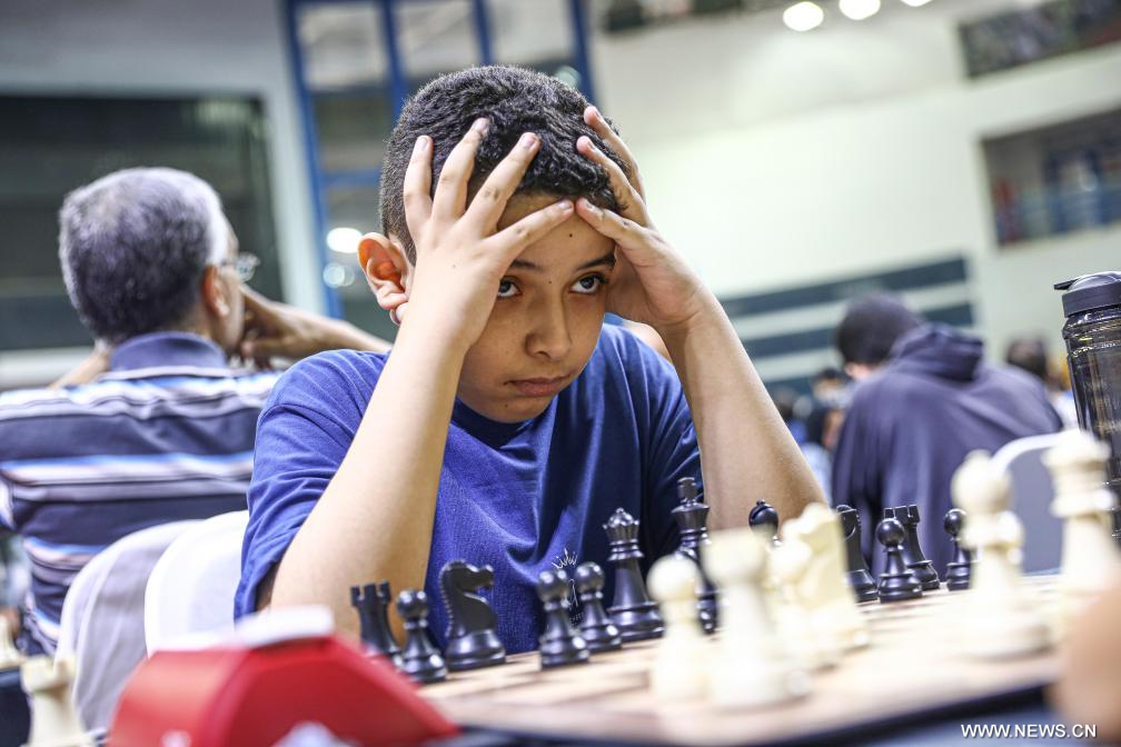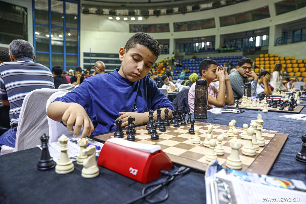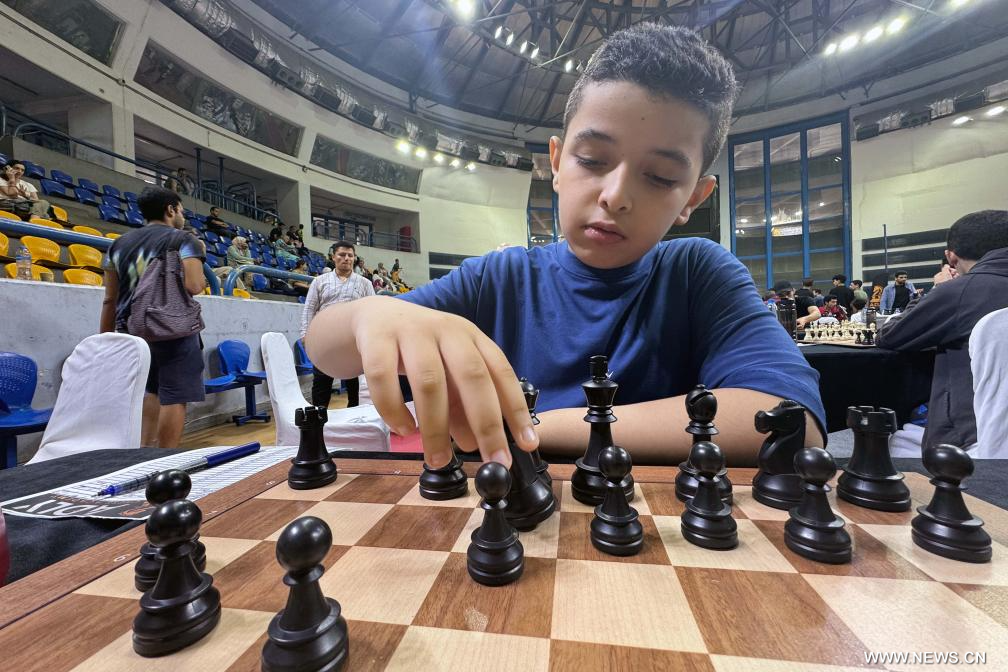القاهرة 22 أغسطس 2024 (شينخوا) في الصورة الملتقطة يوم 13 أغسطس 2024، عبد الرحمن سامح محمد، الطفل البالغ من العمر 10 سنوات، خلال مشاركته في بطولة محلية للشطرنج أقيمت في العاصمة المصرية، القاهرة.
