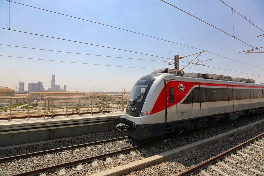 قطار كهربائي خفيف يمر خلال تشغيل تجريبي عبر منطقة الأعمال المركزية بالعاصمة الإدارية الجديدة التي يتم بناؤها شرقي القاهرة بمصر في 3 يوليو 2022. (شينخوا)