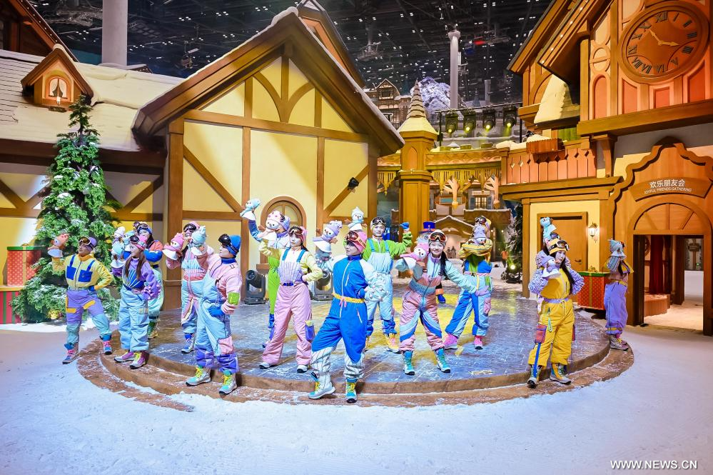 في الصورة الملتقطة يوم 6 سبتمبر 2024، فرقة تؤدي عرضا فنيا في منتجع شانغهاي "إل + الثلج" الداخلي للتزلج في بلدية شانغهاي بشرقي الصين.