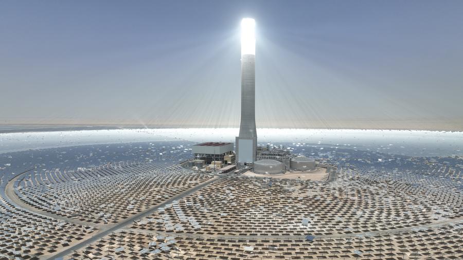 دبي 12 سبتمبر 2024 (شينخوا) على بعد حوالي 65 كيلومترا جنوب وسط مدينة دبي، في مساحة شاسعة من الصحراء، يقف برج حراري شمسي شاهق يبلغ ارتفاعه 262 مترا، وحول هذا البرج، يمتد حقل من حوالي 70000 من مرايا هليوستات، تركز ضوء الشمس على مستقبل الملح المنصهر عند قمة البرج، مما يخلق أشعة ضوئية مبهرة.