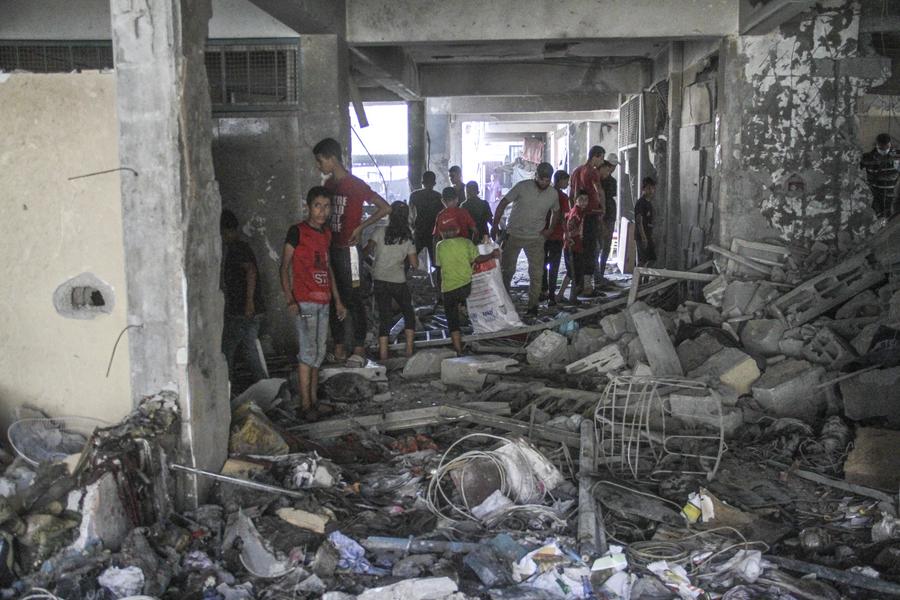 فلسطينيون يتفقدون مبنى مدمرا بعد غارة جوية إسرائيلية على مدرسة تأوي نازحين في حي الزيتون بمدينة غزة في 21 سبتمبر 2024. (شينخوا)