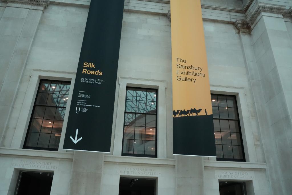لافتات ترويجية لمعرض طريق الحرير معلقة عند مدخل القاعة الرئيسية في المتحف البريطاني في لندن في بريطانيا في 24 سبتمبر 2024. وافتتح المتحف البريطاني معرضا حول طريق الحرير أمام معاينة وسائل الإعلام يوم الثلاثاء، حيث جرى عرض أكثر من 300 قطعة، من بينها قطع قدمتها 29 مؤسسة وطنية ودولية. (شينخوا)