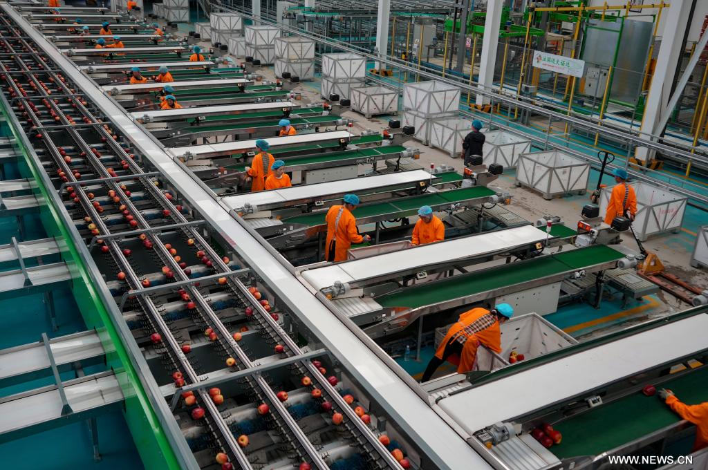 تشاوتونغ 30 سبتمبر 2024 (شينخوا) في الصورة الملتقطة يوم 29 سبتمبر 2024، عمال يعملون في ورشة لفرز ثمار التفاح في قاعدة للإنتاج بمدينة تشاوتونغ في مقاطعة يوننان جنوب غربي الصين.