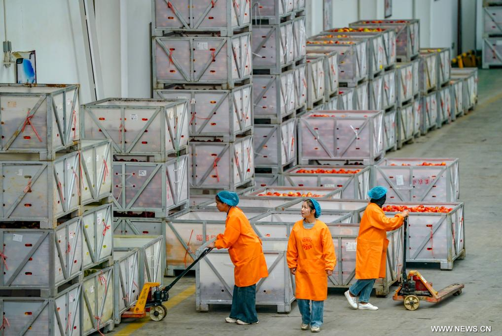 تشاوتونغ 30 سبتمبر 2024 (شينخوا) في الصورة الملتقطة يوم 29 سبتمبر 2024، عمال يعملون في ورشة لتعبئة ثمار التفاح في قاعدة للإنتاج بمدينة تشاوتونغ في مقاطعة يوننان جنوب غربي الصين.