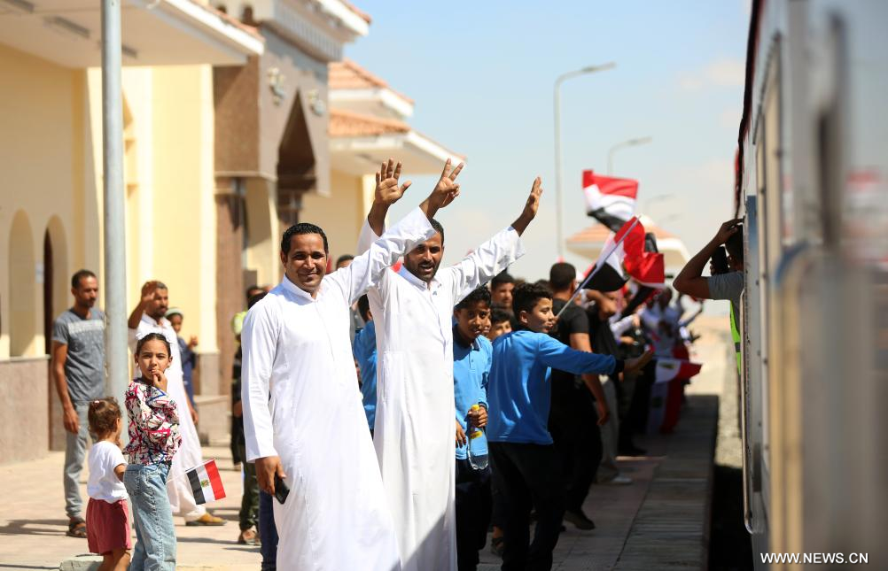 شمال سيناء، مصر 7 أكتوبر 2024 (شينخوا) أعلنت وزارة النقل والصناعة المصرية اليوم (الإثنين) تشغيل أول قطار للسكك الحديدية في شبه جزيرة سيناء شرق القاهرة، بعد توقف دام 50 عاما.