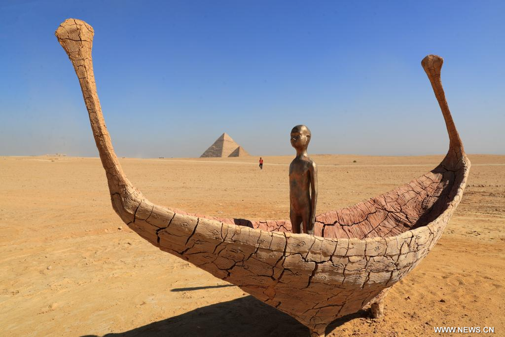 الجيزة 24 أكتوبر 2024 (شينخوا) في الصورة الملتقطة يوم 24 أكتوبر 2024، عرض مجسم فني خلال المعرض الفني الدولي "الأبد هو الآن" في منطقة أهرام الجيزة ذات المناظر الخلابة في الجيزة، مصر.