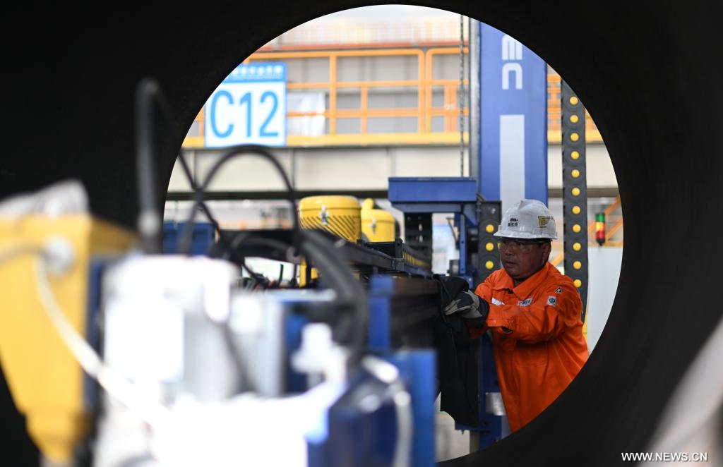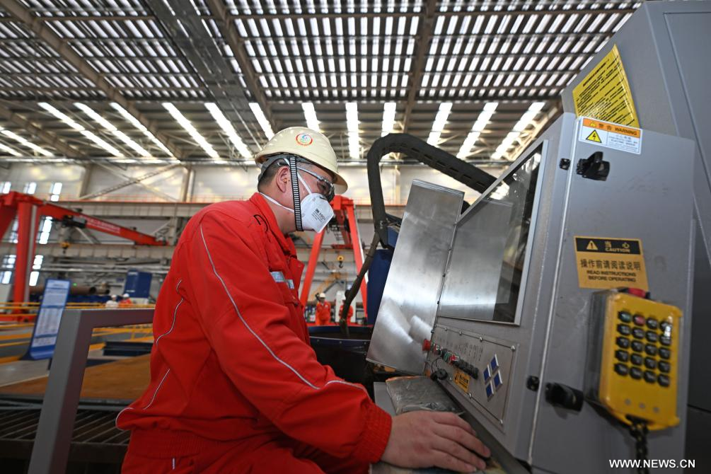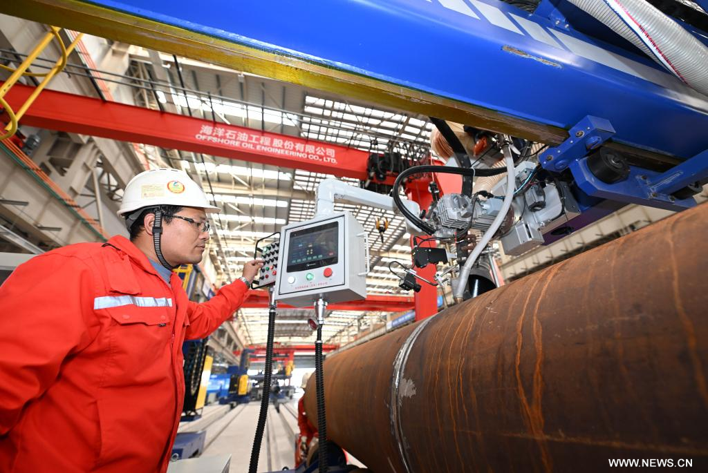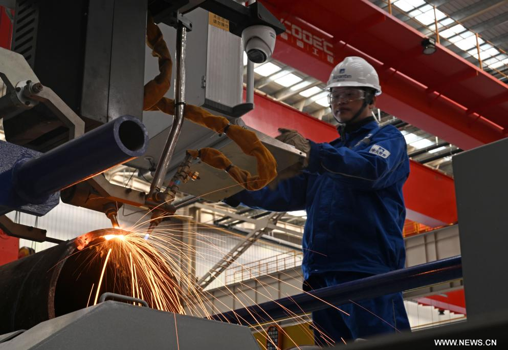 تيانجين أول نوفمبر 2024 (شينخوا) في الصورة الملتقطة يوم 30 أكتوبر 2024، عامل يعمل في قاعدة التصنيع الذكية لمعدات النفط والغاز البحري التابعة للشركة الصينية لهندسة النفط البحري في بلدية تيانجين بشمالي الصين.