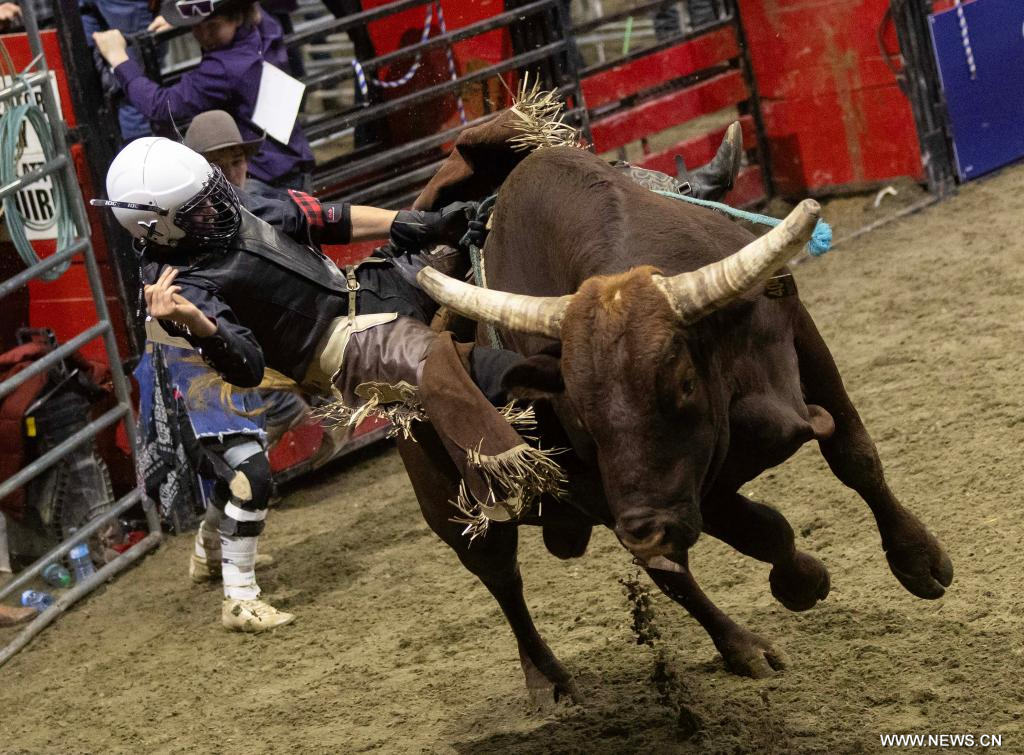 تورنتو 11 نوفمبر 2024 (شينخوا) في الصورة الملتقطة يوم 10 نوفمبر 2024، راعي البقر أوستن إيلمان، يتنافس خلال مسابقة ركوب الثيران في مسابقة الروديو الملكي ضمن معرض الخيول الملكي لعام 2024، في تورنتو بكندا.