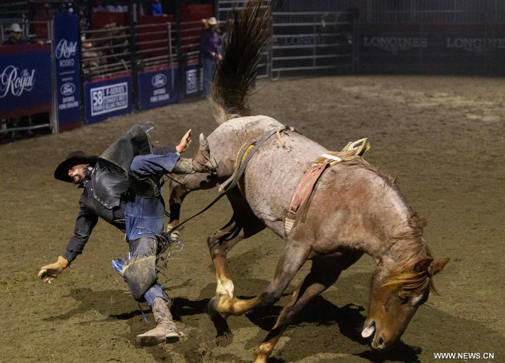 تورنتو 11 نوفمبر 2024 (شينخوا) في الصورة الملتقطة يوم 10 نوفمبر 2024، مشهد للحظة سقوط راعي البقر، تريفور فان ألستين، من فوق حصانه خلال مسابقة ركوب الخيل غير المروضة في مسابقة الروديو الملكي ضمن معرض الخيول الملكي لعام 2024، في تورنتو بكندا.