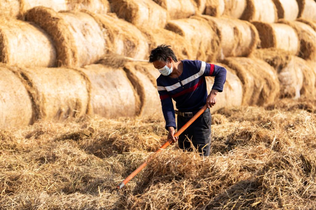 تشانغشا 2 ديسمبر 2024 (شينخوا) في الصورة الملتقطة يوم أول ديسمبر 2024، عامل يجفف القش في مصنع لتحويل القش إلى علف في محافظة نانشيان بمقاطعة هونان في وسط الصين.