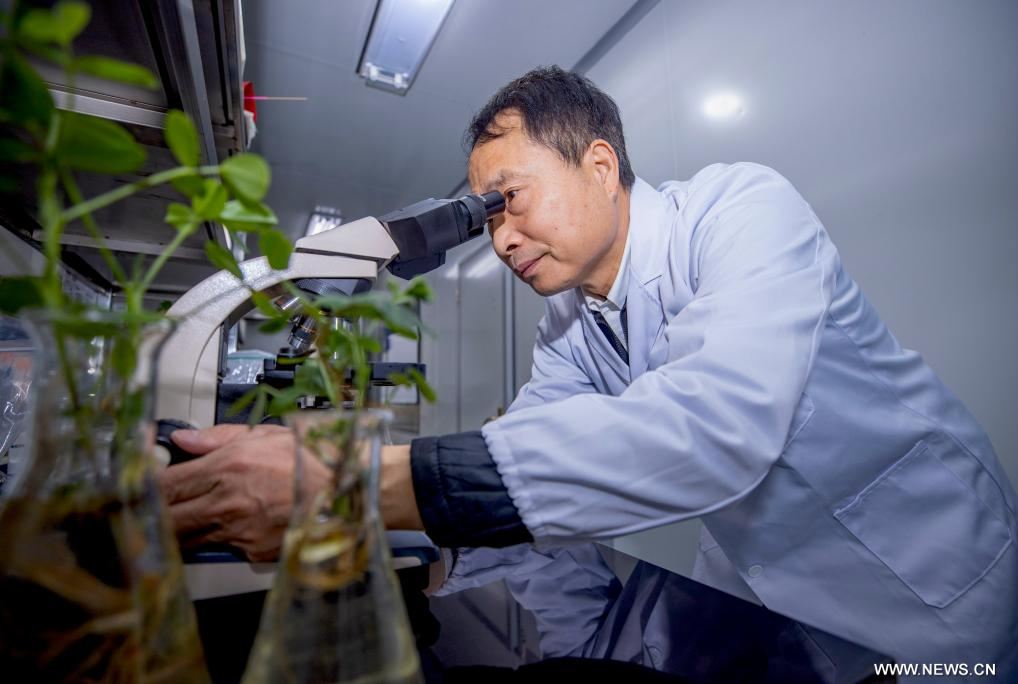 يينتشوان 9 ديسمبر 2024 (شينخوا) في الصورة الملتقطة يوم 6 ديسمبر 2024، يانغ قوه بينغ الأستاذ بجامعة مينتسو الشمالية يقوم بدراسة كائنات حية دقيقة في مختبر بمنطقة نينغشيا ذاتية الحكم لقومية هوي بشمال غربي الصين.
