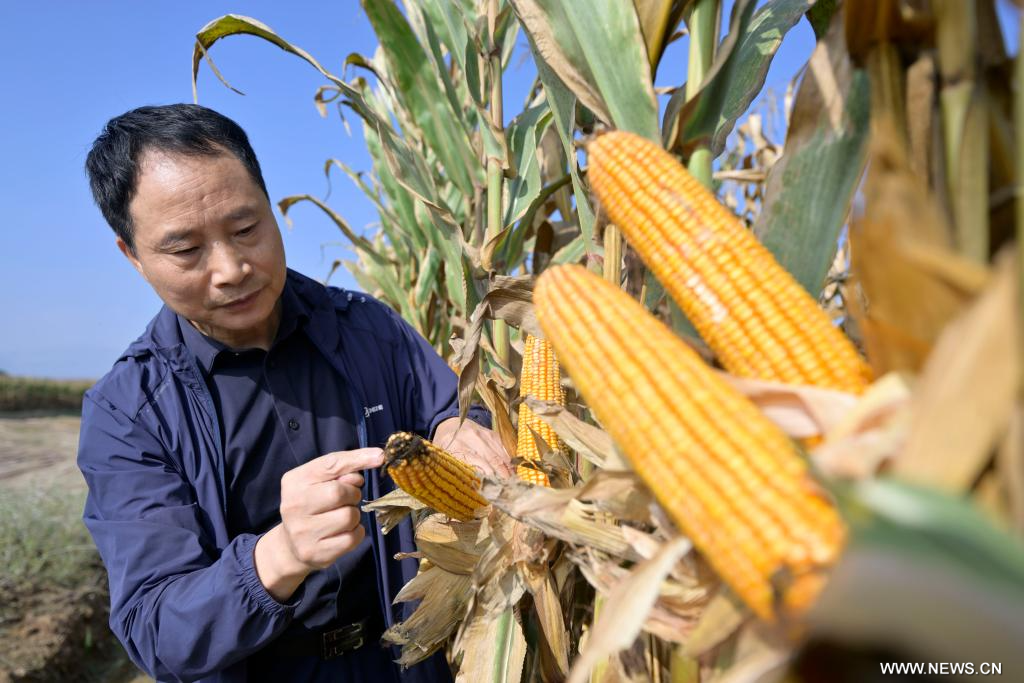 يينتشوان 9 ديسمبر 2024 (شينخوا) في الصورة الملتقطة يوم 12 أكتوبر 2024، يانغ قوه بينغ الأستاذ بجامعة مينتسو الشمالية يعاين الذرة المزروعة في حقل ملحي وقلوي بمنطقة نينغشيا ذاتية الحكم لقومية هوي بشمال غربي الصين.