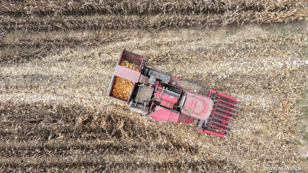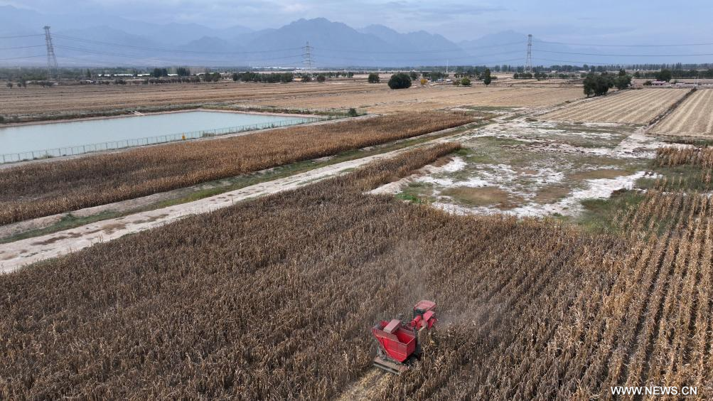 يينتشوان 9 ديسمبر 2024 (شينخوا) في الصورة الملتقطة يوم 12 أكتوبر 2024 بواسطة طائرة مسيرة، آلة حصاد تحصد الذرة المزروعة في حقل ملحي وقلوي بمنطقة نينغشيا ذاتية الحكم لقومية هوي بشمال غربي الصين.
