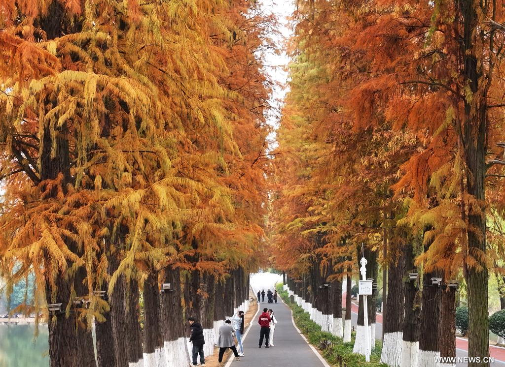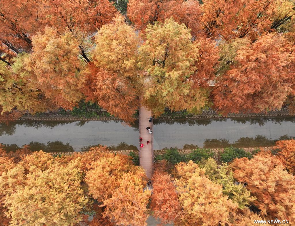 بكين 21 ديسمبر 2024 (شينخوا) في الصورة الملتقطة جوا يوم 19 ديسمبر 2024، زوار يتنزهون في غابة من أشجار السرو المائي في حي يانفنغ بمدينة هنغيانغ بمقاطعة هونان بوسط الصين.
