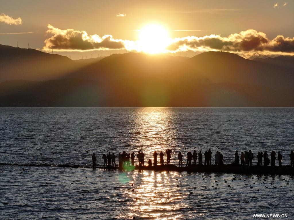 بكين 21 ديسمبر 2024 (شينخوا) في الصورة الملتقطة جوا يوم 20 ديسمبر 2024، سياح يشاهدون شروق الشمس على ضفاف بحيرة أرهاي في مدينة دالي بمقاطعة يوننان بجنوب غربي الصين.
