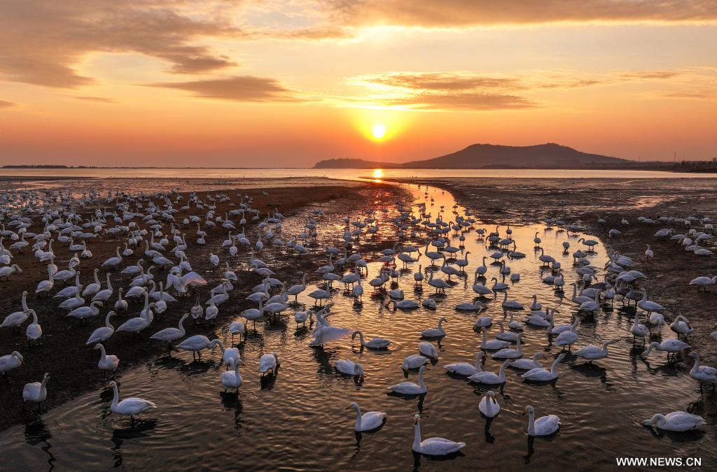بكين 21 ديسمبر 2024 (شينخوا) في الصورة الملتقطة يوم 20 ديسمبر 2024، أسراب من البجع في أرض بحيرة البجع الرطبة بمدينة رونغتشنغ بمقاطعة شاندونغ بشرقي الصين.