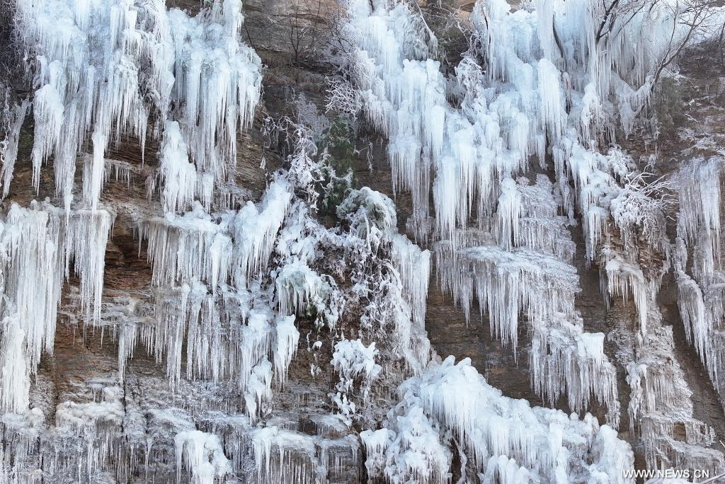 بكين 21 ديسمبر 2024 (شينخوا) في الصورة الملتقطة يوم 20 ديسمبر 2024، منظر للجليد المعلق على جرف جبلي في قرية ياندي في حي شانتينغ في مدينة تساوتشوانغ بمقاطعة شاندونغ بشرقي الصين.
