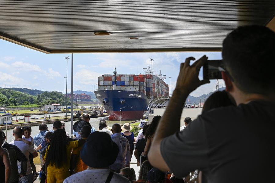 زوار يشاهدون سفينة شحن تبحر عبر قناة بنما بالقرب من مدينة بنما سيتي في بنما بتاريخ 28 أغسطس 2024. (شينخوا)