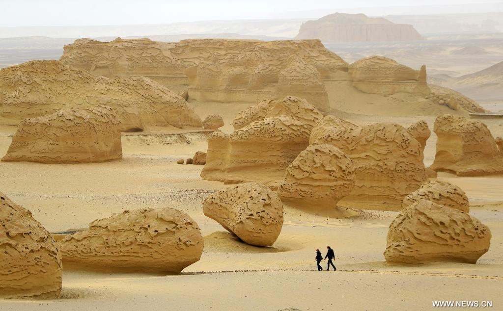 القاهرة 27 ديسمبر 2024 (شينخوا) في الصورة الملتقطة يوم 26 ديسمبر 2024، سياح يزورون وادي الحيتان في الفيوم بمصر. يتميز وادي الحيتان، الذي يقع في صحراء الفيوم، ببقايا أحفورية لا تقدر بثمن لأقدم وأكبر سلالات الحيتان المنقرضة، الأرتشاوسيتي.