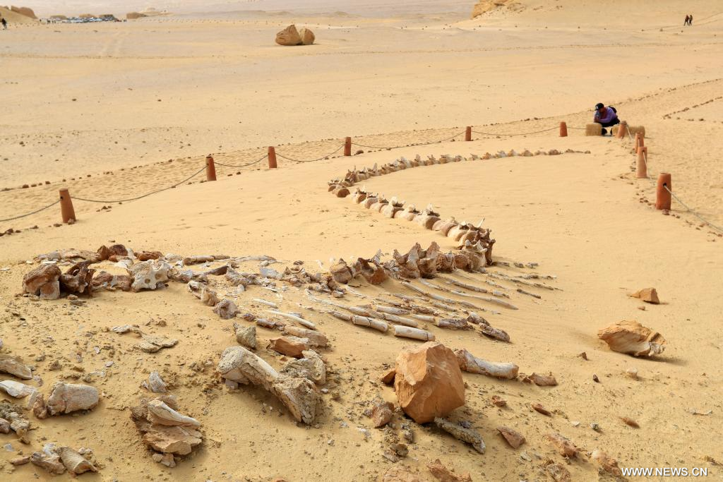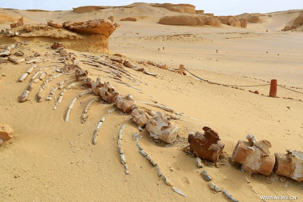 القاهرة 27 ديسمبر 2024 (شينخوا) في الصورة الملتقطة يوم 26 ديسمبر 2024، بقايا حفريات الحوت في وادي الحيتان في الفيوم بمصر. يتميز وادي الحيتان، الذي يقع في صحراء الفيوم، ببقايا أحفورية لا تقدر بثمن لأقدم وأكبر سلالات الحيتان المنقرضة، الأرتشاوسيتي.