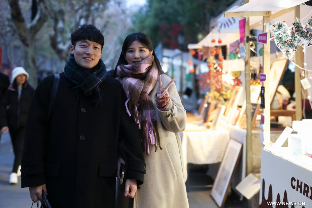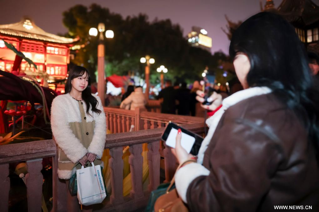 شانغهاي 30 ديسمبر 2024 (شينخوا) في الصورة الملتقطة يوم 25 ديسمبر 2024، سائحان من كوريا الجنوبية يقفان لالتقاط الصور في منطقة تجارية في شانغهاي بشرقي الصين. وبرزت شانغهاي كوجهة رئيسية للسياح الكوريين الجنوبيين حيث أعلنت الصين عن تخفيف كبير لسياسة العبور بدون تأشيرة.