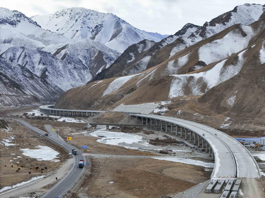 في الصورة الملتقطة جوا بطائرة بدون طيار يوم 25 ديسمبر 2024، الطريق السريع الذي يربط محافظتي أورومتشي ويويلي في منطقة شينجيانغ الويغورية ذاتية الحكم بشمال غربي الصين.(شينخوا)
