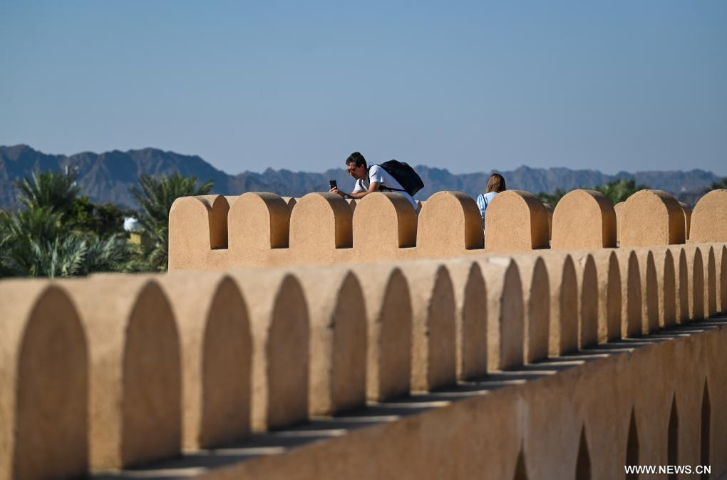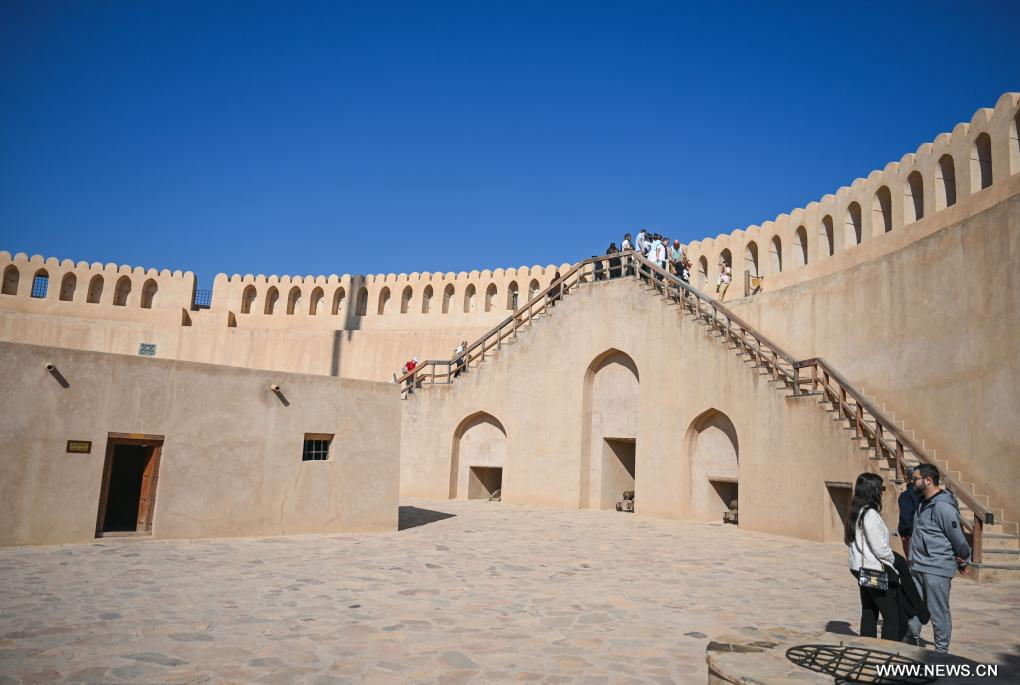 نزوى 11 يناير 2025 (شينخوا) في الصورة الملتقطة يوم 10 يناير 2025، سياح يزورون قلعة نزوى في نزوى في عمان. ويعتبر قلعة نزوى، قلعة دائرية كبيرة، مقصدا سياحيا شهيرا في سلطنة عمان.