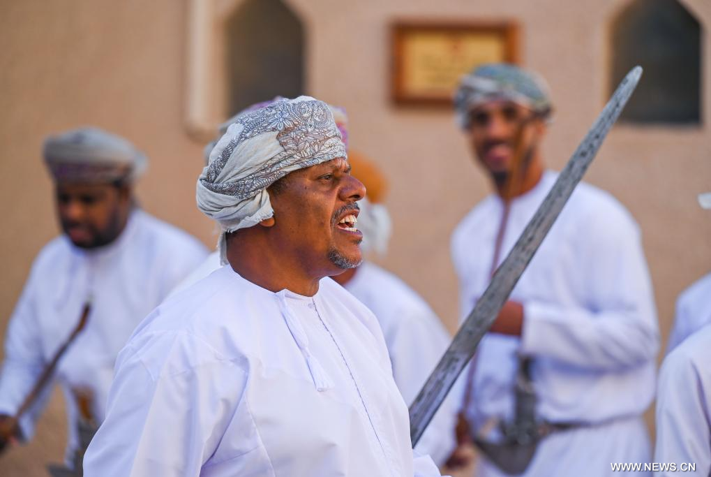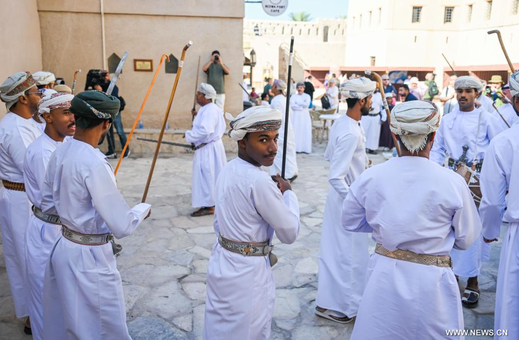 نزوى 11 يناير 2025 (شينخوا) في الصورة الملتقطة يوم 10 يناير 2025، راقصون يقدمون عرضا في منطقة قلعة نزوى الخلابة في نزوى في عمان. ويعتبر قلعة نزوى، قلعة دائرية كبيرة، مقصدا سياحيا شهيرا في سلطنة عمان.