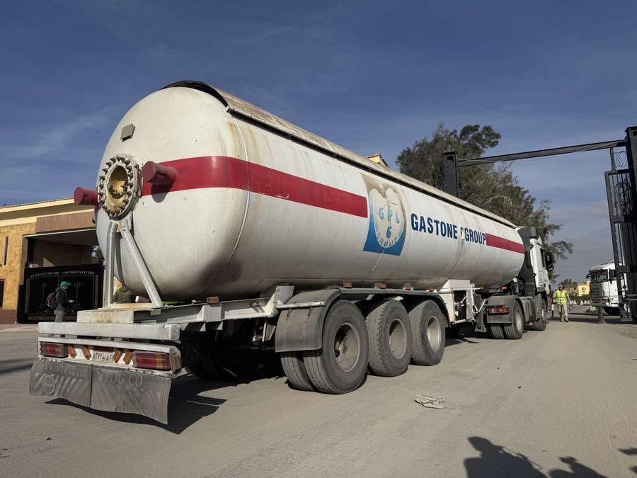 غزة 19 يناير 2025 (شينخوا) عند مدخل معبر رفح، النقطة الحدودية الوحيدة بين قطاع غزة ومصر، تغير المشهد في جانبه الفلسطيني اليوم (الأحد) مع تدفق شاحنات محملة بالمساعدات الإنسانية إلى القطاع إثر سريان اتفاق وقف إطلاق النار بين حركة المقاومة الإسلامية (حماس) وإسرائيل.