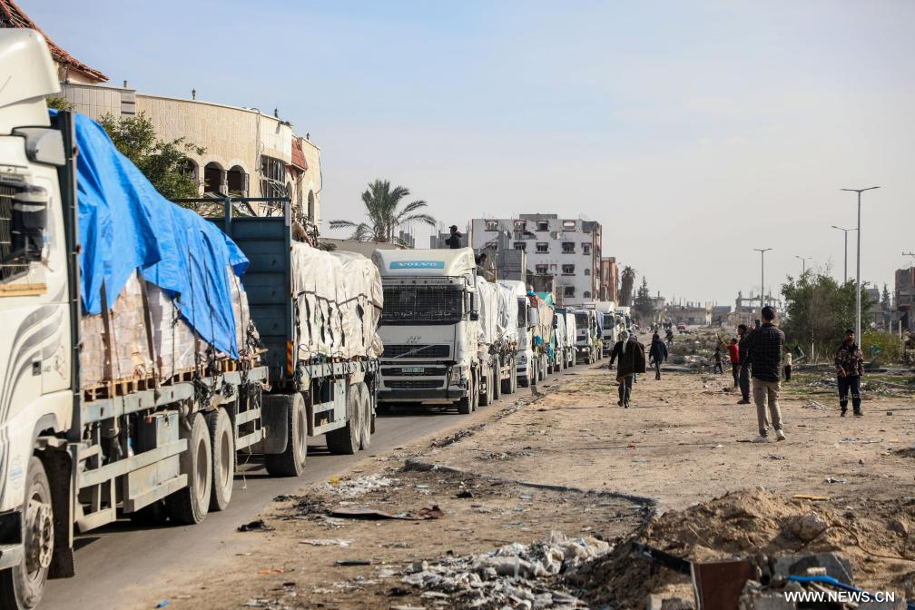 رفح 20 يناير 2025 (شينخوا) في الصورة الملتقطة يوم 19 يناير 2025، شاحنات محملة بمساعدات إنسانية في مدينة رفح جنوبي قطاع غزة.