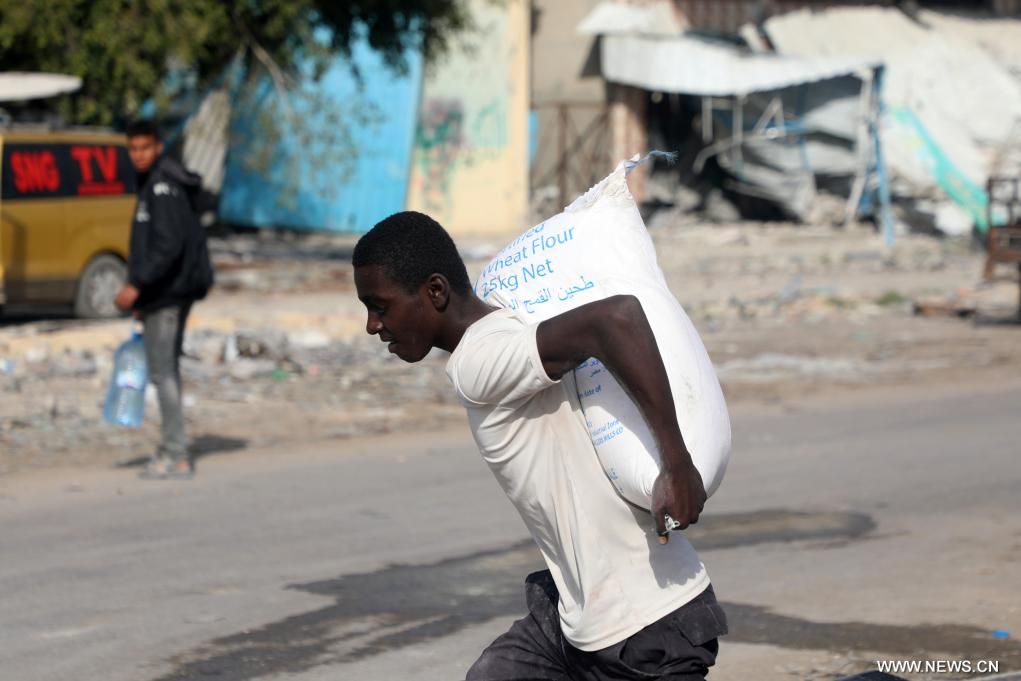 رفح 20 يناير 2025 (شينخوا) في الصورة الملتقطة يوم 19 يناير 2025، شاب يحمل كيسا من الطحين حصل عليه من شاحنات محملة بمساعدات إنسانية في مدينة رفح جنوبي قطاع غزة.