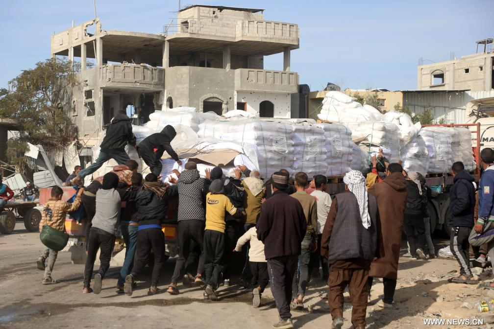 رفح 20 يناير 2025 (شينخوا) في الصورة الملتقطة يوم 19 يناير 2025، أشخاص يحصلون على الاحتياجات اليومية الأساسية التي تم توصيلها بواسطة شاحنات محملة بمساعدات إنسانية في مدينة رفح جنوبي قطاع غزة.