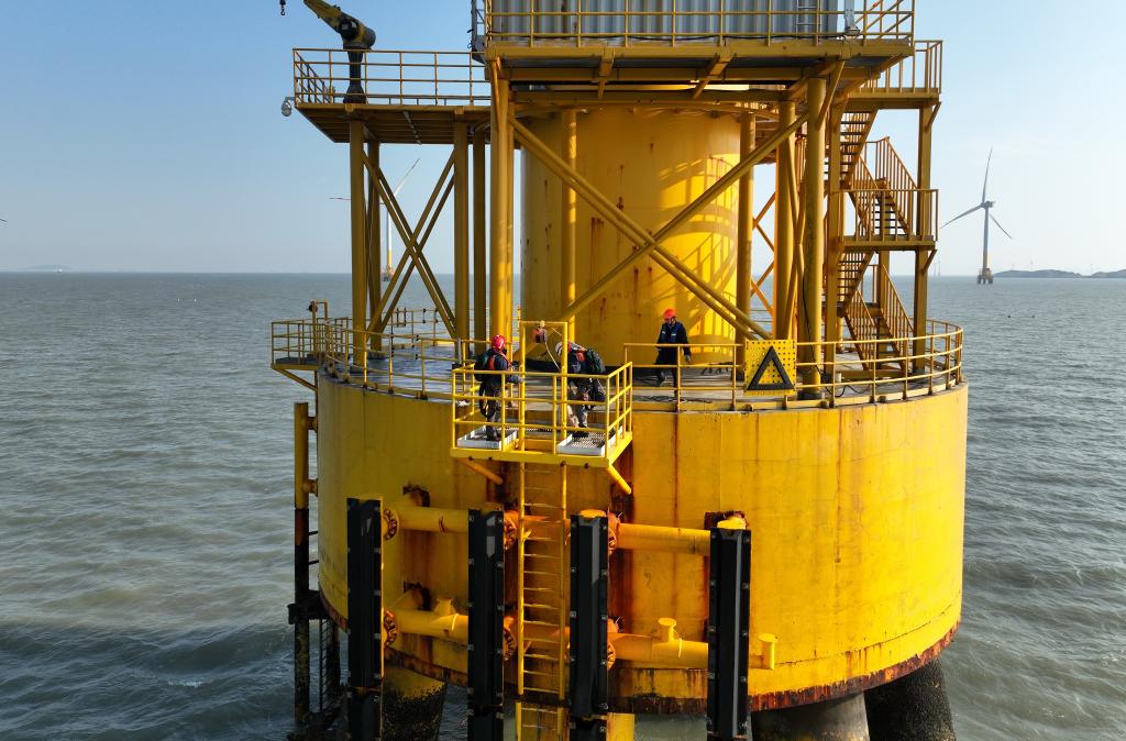 بوتيان 22 يناير 2025 (شينخوا) في الصور الملتقطة يوم 19 يناير 2025، عمال يعملون في القواعد الأساسية لتوربينات الرياح البحرية في خليج بينغهاي بمدينة بوتيان في مقاطعة فوجيان بجنوب شرقي الصين. وشهدت صناعة توليد طاقة الرياح البحرية تطورات سريعة في الصين، مما يتطلب أعمال الفحص والصيانة الدائمة لضمان التشغيل السلس لهذه الآلات الضخمة.■