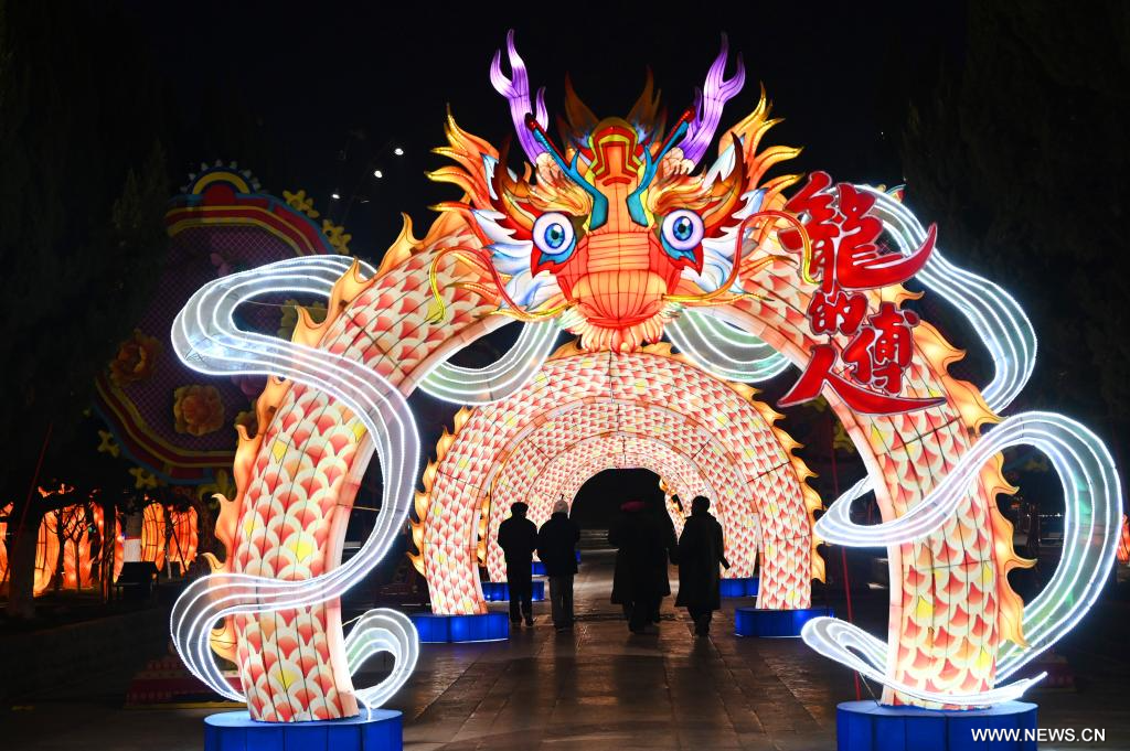 بكين 22 يناير 2025 (شينخوا) في الصورة الملتقطة يوم 22 يناير 2025، سياح يسيرون عبر فانوس على شكل تنين في حديقة لونغتينغ في مدينة كايفنغ بمقاطعة خنان وسط الصين.
