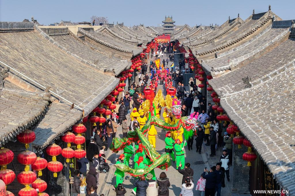 بكين 22 يناير 2025 (شينخوا) في الصورة الملتقطة يوم 22 يناير 2025، فنانون شعبيون يؤدون رقصة التنين في بلدة بينغياو القديمة في مدينة جينتشونغ بمقاطعة شانشي شمالي الصين.