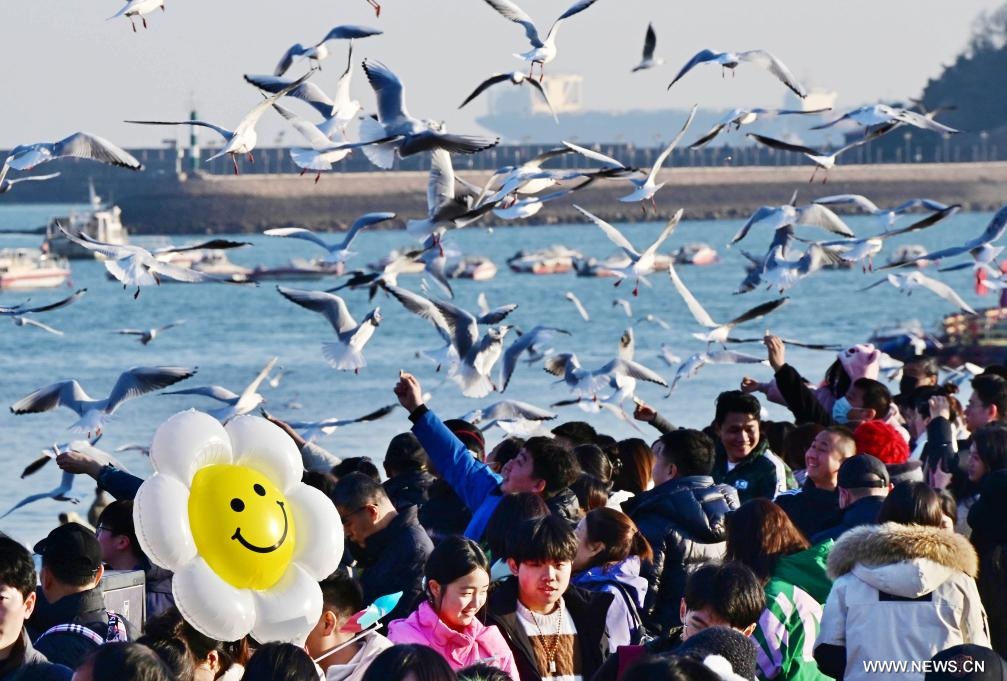 مشاهد لطيور النورس وهي تحلق في سماء مدينة تشينغداو الصينية