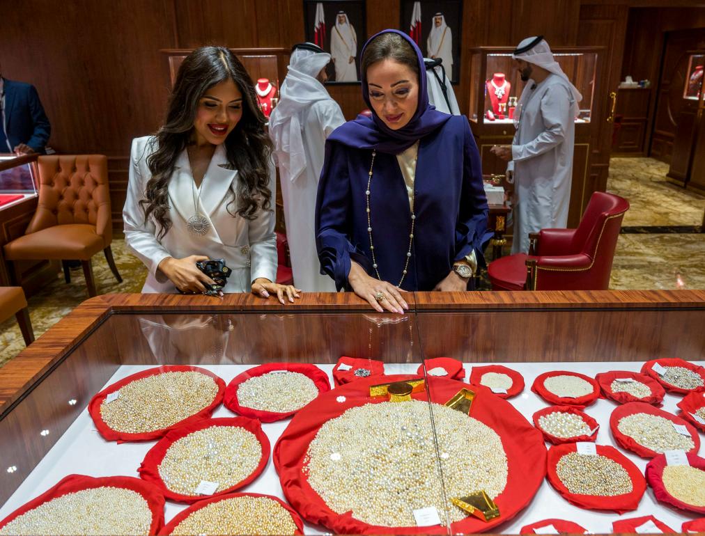 الدوحة أول فبراير 2025 (شينخوا) في الصورة الملتقطة يوم 31 يناير 2025، زائرتان تشاهدان مجموعة من اللؤلؤ خلال فعاليات النسخة الحادية والعشرين من معرض الدوحة للمجوهرات والساعات في قطر. وافُتتح المعرض يوم 30 يناير الماضي وتستمر فعالياته حتى 5 فبراير.