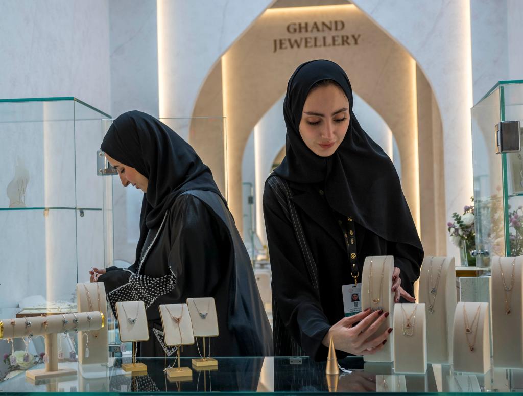 الدوحة أول فبراير 2025 (شينخوا) في الصورة الملتقطة يوم 31 يناير 2025، عارضتان تقومان بترتيب المجوهرات خلال فعاليات النسخة الحادية والعشرين من معرض الدوحة للمجوهرات والساعات في قطر. وافُتتح المعرض يوم 30 يناير الماضي وتستمر فعالياته حتى 5 فبراير.