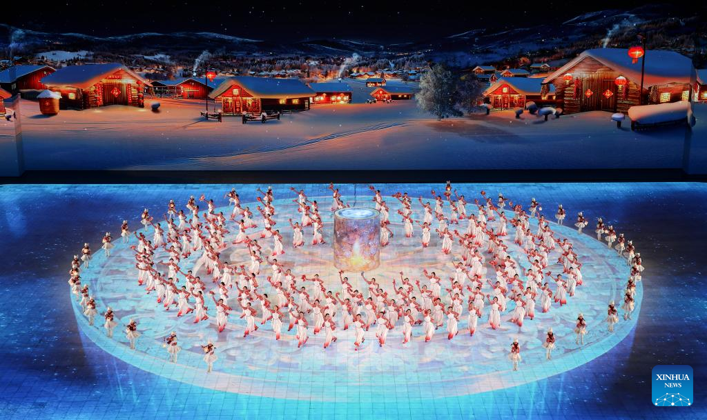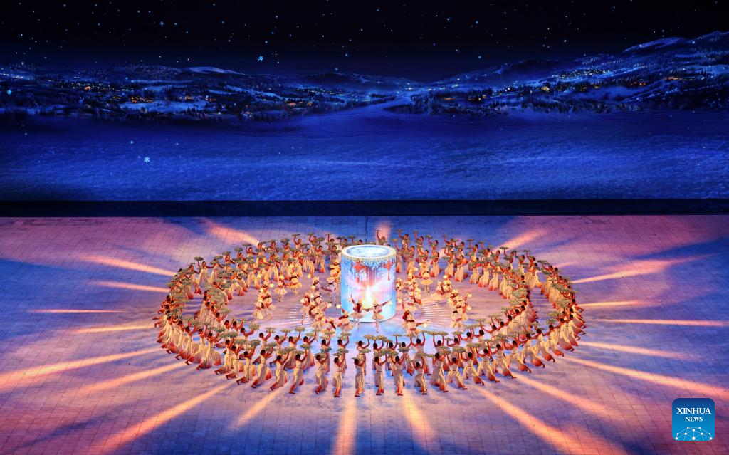 بلغت مراسم الافتتاح ذروتها عندما قام أربعة من حاملي الشعلة -البطلة الأولمبية مرتين ولاعبة التزلج السريع على المضمار القصير يانغ يانغ، وأول صيني يفوز بالميدالية الذهبية في الألعاب الأولمبية الشتوية في التزلج الحر (رجال) هان شياو بنغ، وبطل سباق المشي الأولمبي وانغ تشن، وبطلة التزلج السريع في أولمبياد سوتشي تشانغ هونغ- بمشاركة أطفال يحملون فوانيس جليدية، بإضاءة المرجل الأرجواني الشكل في الموقع الفرعي لمراسم الافتتاح، "عالم هاربين للجليد والثلج"، وهو أكبر منتزه ترفيهي للجليد والثلج في العالم.